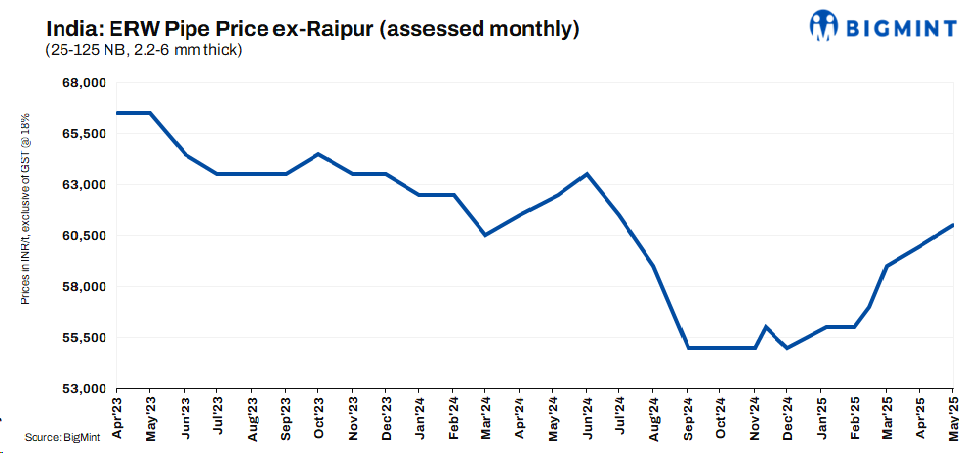 A major Indian ERW pipe manufacturer, specialising in hot-rolled coil (HRC) based products, has increased list prices of its base-grade pipes (25-125 NB, 2.2-6 mm) by INR 1,000/tonne (t) ($12/t) for early-May 2025 sales, sources informed BigMint.
