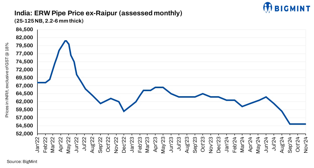 A major electric resistance welded (ERW) pipe manufacturer, specialising in hot-rolled coil-based products, kept list prices stable for its base-grade pipes (25-125 NB, 2.2-6 mm) for early-November 2024 sales, sources informed BigMint. Tags now stand at INR 55,000/tonne (t) ($654/t) exw in Raipur and INR 57,000/t ($678/t) exw in Hyderabad, Bangalore, Delhi, Mumbai, and Pune (both prices exclusive of 18% GST).