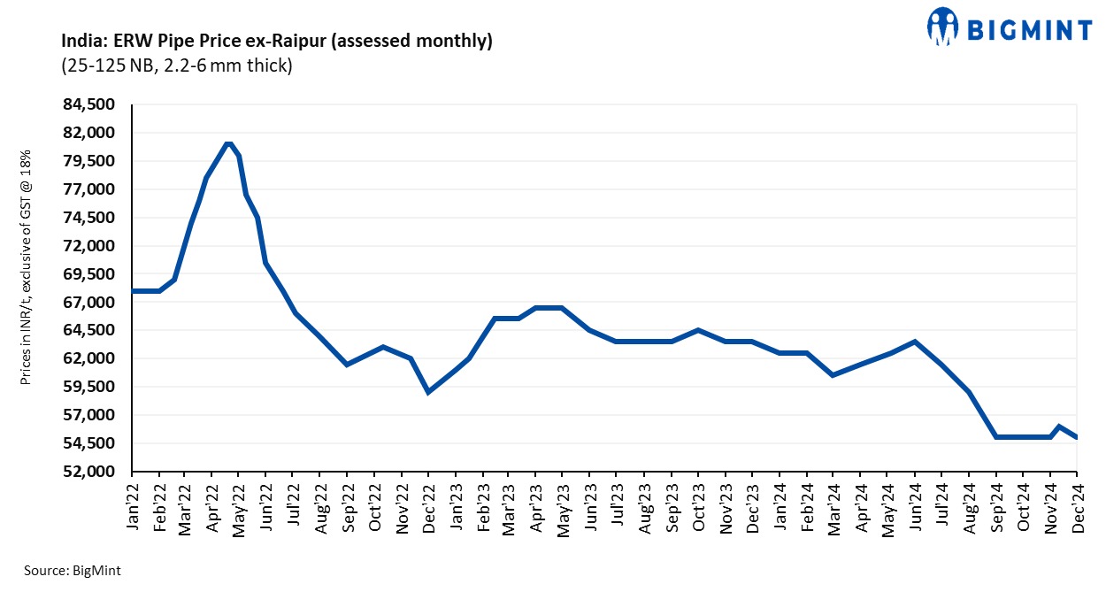 However, distributor-level monthly average prices of ERW pipes in Raipur increased to INR 51,900/t exy in November against INR 51,000/t in October.