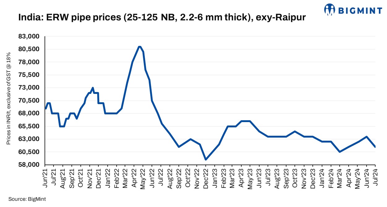 Distributor-level monthly average prices of ERW pipes in Raipur also fell by INR 500/t ($6/t) m-o-m to INR 59,800/t ($716/t) exy-Raipur in June against INR 60,300/t ($722/t) in May 2024.
