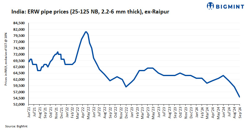 Distributor-level monthly average prices of ERW pipes in Raipur also fell by INR 3,200/t ($38/t) m-o-m to INR 54,800/t ($653/t) exy-Raipur in August against INR 58,000/t ($691/t) in July 2024.