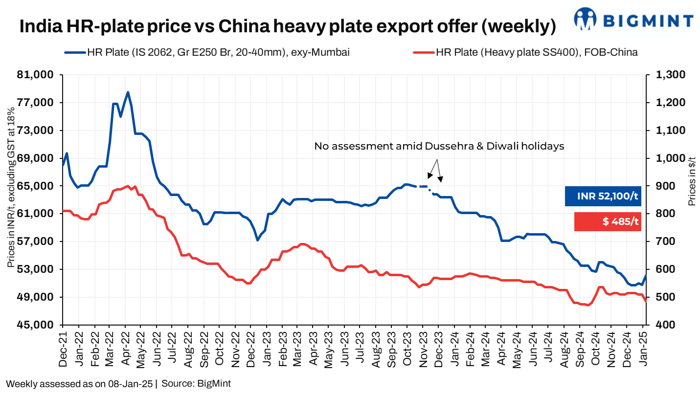 HR plate prices increase: BigMint’s weekly assessment for HR plates (IS 2062, Gr E250 Br, 20-40 mm) stood at INR 49,000-52,500/t exy-Mumbai as of 8 January 2025, reflecting an increase of INR 1,300/t w-o-w. Meanwhile, prices of hot strip mill (HSM) plates (IS 2062, Gr E250 Br, 5-10 mm) rose by INR 100/t w-o-w to INR 47,500/49,000/t exy-Mumbai. Prices mentioned above exclude 18% GST.