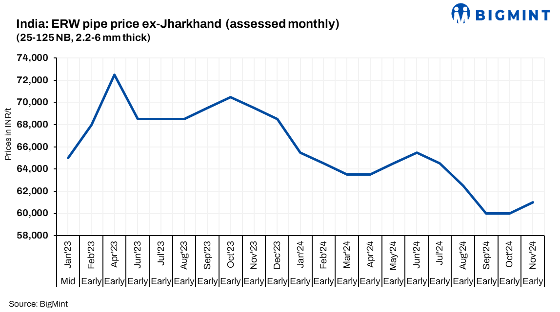 A major eastern India-based steel manufacturer, specialising in ERW pipes, has announced an increase in list prices by approximately INR 1,000/t ($12/ton) m-o-m for early-Nov’24 sales. Post revision, effective prices for base grade ERW pipes (25-125 NB, 2.2-6 mm thickness) are at INR 61,000/t ($723/t) ex-Jharkhand, excluding GST at 18%. The company has announced a price adjustment, driven primarily by the escalation in raw material costs.