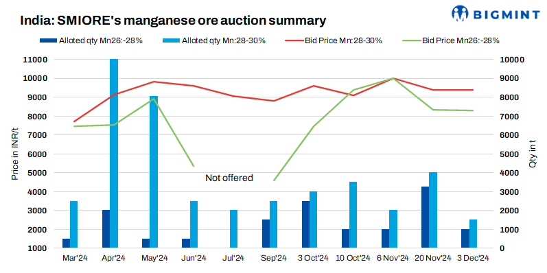 On 3 December 2024, Sandur Manganese & Iron Ore Ltd (SMIORE) auctioned 34,272 tonnes (t) of manganese ore (Mn: 20-35%, -10-100mm). Approximately 11,592 t were sold at prices ranging from INR 2,500-12,400/t, while the remaining 22,680 t remained unsold, as per sources.