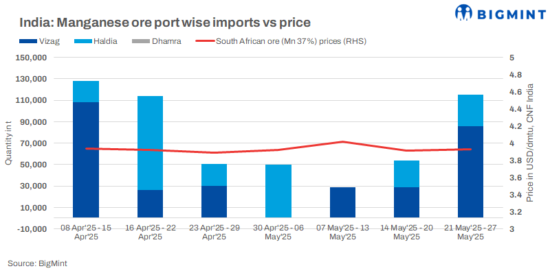 Imported ore arrivals to India up w-o-w: Imported manganese ore arrivals to India rose by 114% w-o-w, with shipments totalling 115,134 t over 21-27 May compared to 53,950 t in the previous week.