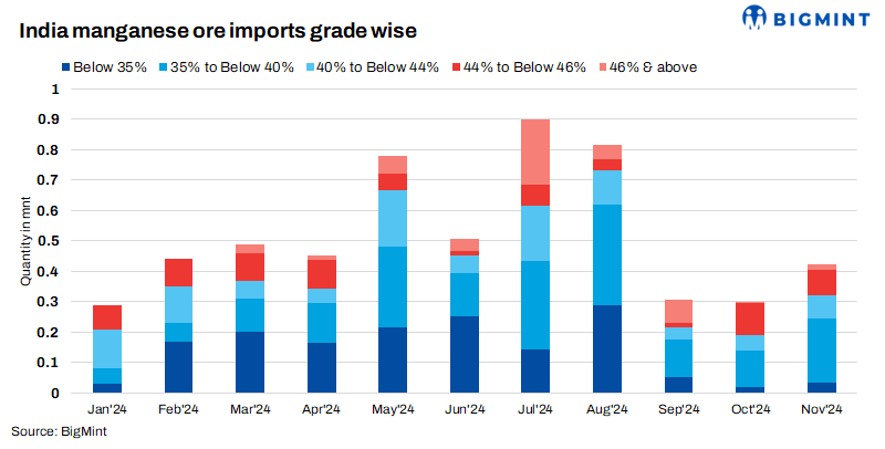 India’s manganese ore imports climbed up significantly by 40% m-o-m in November 2024, data maintained with BigMint reveals. The volume increased to 0.42 million tonnes (mnt) in November against 0.3 mnt in October.