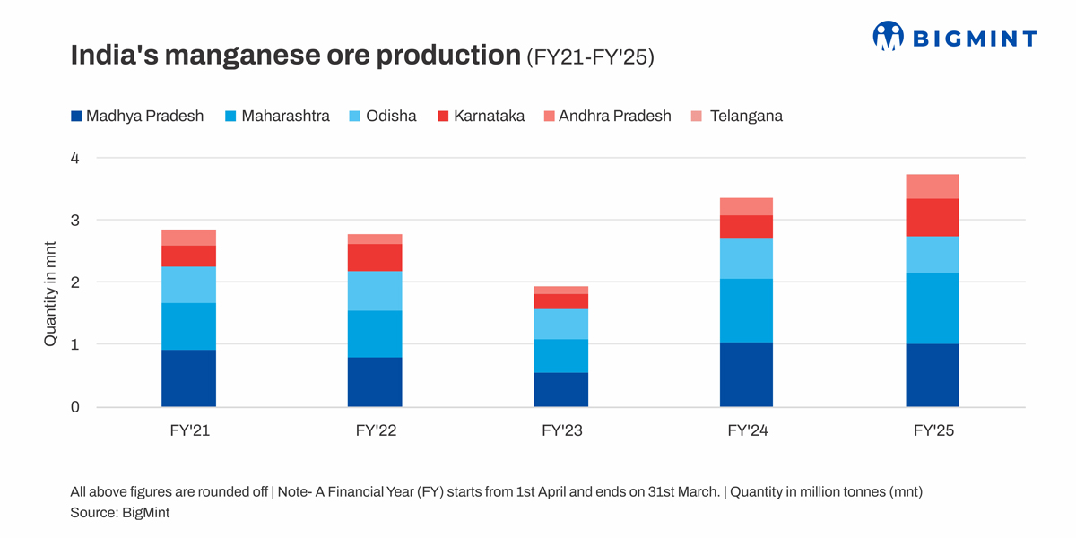 Maharashtra, driven by MOIL’s operations and technological upgrades, recorded an 11% y-o-y rise, producing 1.15 mnt. Meanwhile, Madhya Pradesh and Odisha saw slight declines, reflecting operational challenges and reserve depletion.
