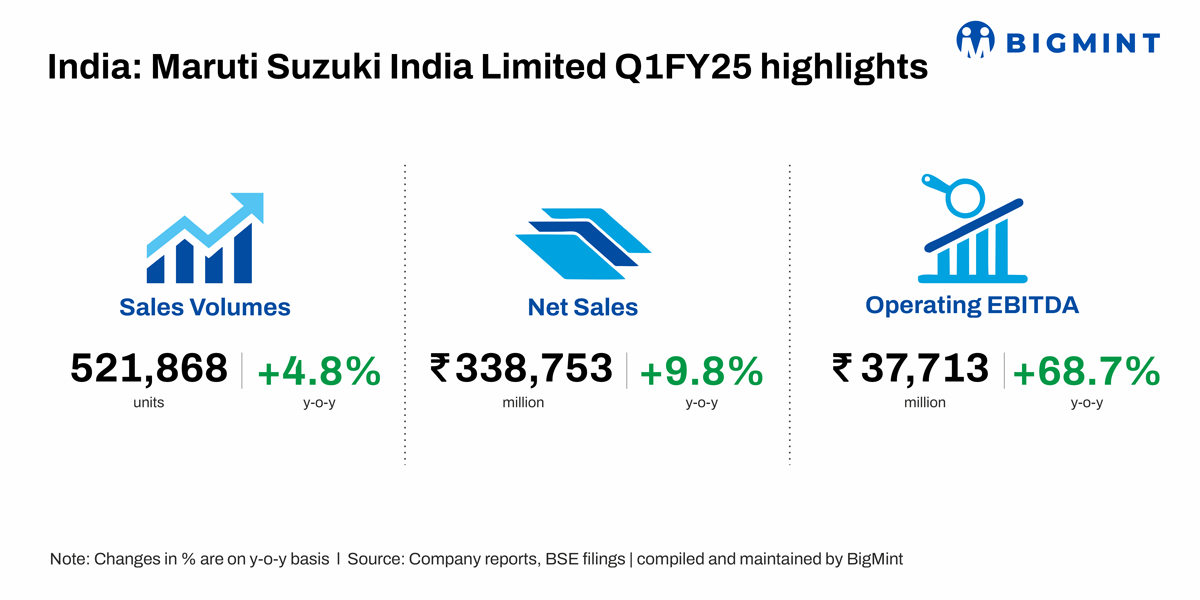 Maruti Suzuki India Limited’s (MSIL) sales volume rose nearly 5% y-o-y to 521,868 units in Q1FY’25 as against 498,030 units in Q1FY’24. The company’s net sales increased 9.8% on the year to INR 338,753 million in the quarter from INR 308,452 million in the CPLY. Operating EBITDA witnessed 68.7% surge y-o-y to INR 37,713 million in Q1FY’25 against INR 22,355 million in the CPLY.