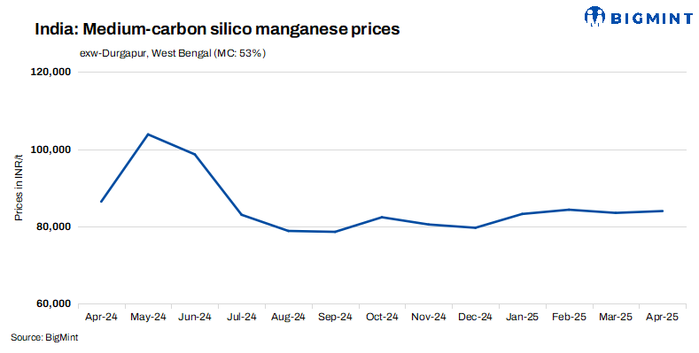 India’s medium-carbon silico manganese prices (Mn: 53%, Si: 20%, C: 0.5% max) inched up by INR 500/t ($6/t) w-o-w to INR 84,000/t ($981/t) exw-Durgapur on 03 Apr’25. Offers ranged within INR 82,000-84,500/t ($958-987/t), with deals of around 7,300 t concluded at INR 82,000-84,000/t ($958-981/t). Prices rose due to increasing production costs, with the DVC in Bengal has increase power tariff by INR 1-1.20/unit, and a slight increase in high-grade Mn ore prices by MOIL.
