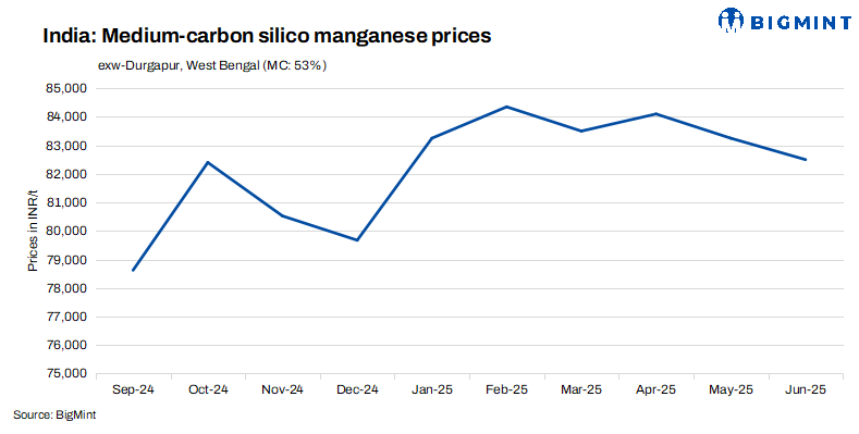 India’s medium-carbon silico manganese prices (Mn: 53%, Si: 20%, C: 0.5% max) dropped by INR 1,000/t ($12/t) w-o-w at INR 82,500/t ($962/t) exw-Durgapur on 5 Jun’25. Indicative offers ranged between INR 82,000-83,000/t ($957-968/t), with a deal for around 120 t concluded at INR 82,000/t ($957/t). Prices are falling due to weaker purchasing trends and a consistent weekly decrease in high-grade ore market rates and demand.