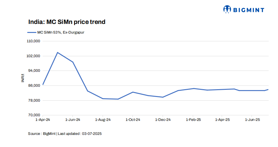 India’s medium-carbon silico manganese prices (Mn: 53%, Si: 20%, C: 0.5% max) edged down by INR 500/t ($6/t) w-o-w to INR 83,800/t ($982/t) exw-Durgapur on 3 Jul’25. Offers ranged between INR 83,500-84,000/t ($978-984/t), with some deals for around 270 t concluded within INR 83,500-84,000/t ($978-984/t). Prices edged lower due to restrained procurement activity, as market participants maintained caution amid soft demand.