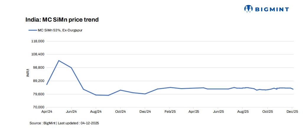 Medium-carbon silico manganese (Mn 53%, Si 20%, C max 0.5%) prices in India dipped by INR 900/t ($10/t) w-o-w to INR 83,000/t ($927/t). Prices softened due to sluggish steel sector procurement, ample inventories with traders, and limited export inquiries, which kept market sentiment subdued. Offers were heard in the range of INR 82,500-84,000/t ($922-938/t), while a deal for 600 t was concluded at INR 83,000/t ($941/t).