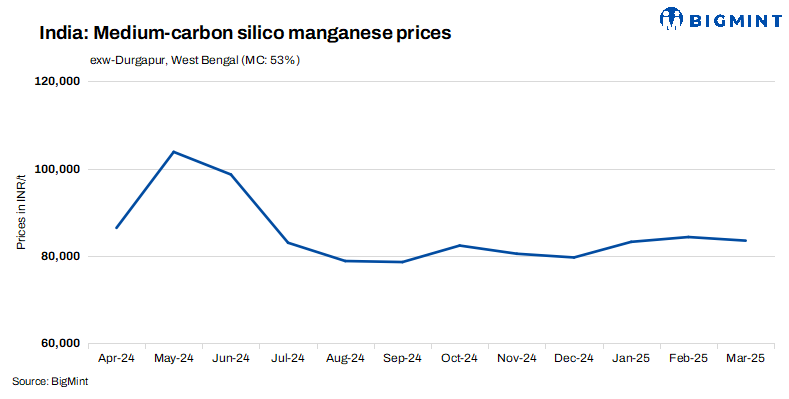 India’s medium-carbon silico manganese prices (Mn: 53%, Si: 20%, C: 0.5% max) fell by INR 500/t ($6/t) w-o-w to INR 83,500/t ($975/t) exw-Durgapur on 27 Mar’25. Offers ranged within INR 84,000-85,000/t ($980-992/t), with deals of around 850 t concluded at INR 81,000-84,000/t ($945-980/t). Slight declines are driven by need-based purchasing and a dip in high-grade manganese ore prices.
