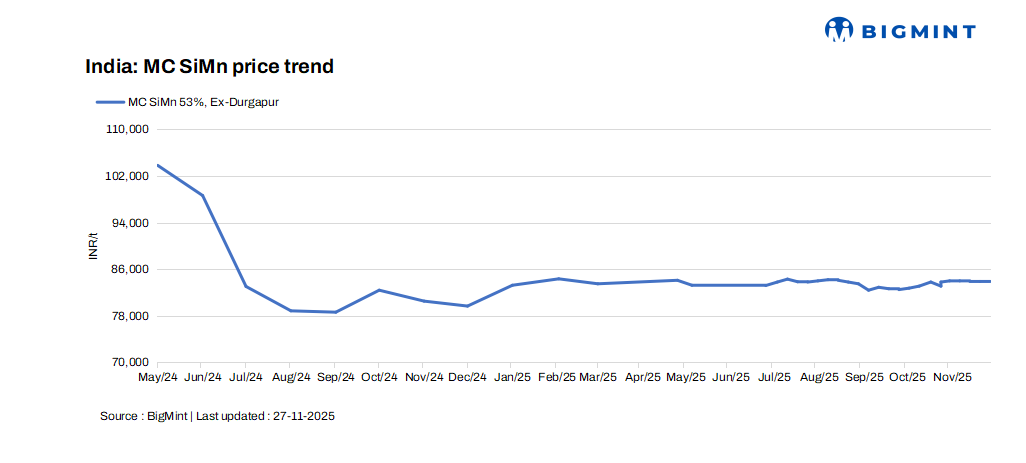 Medium-carbon silico manganese (Mn 53%, Si 20%, C max 0.5%) prices in India remained flat w-o-w at INR 83,900/t ($940/t). Muted demand from steelmakers, steady supply, and buyers’ reluctance to commit amid uncertain procurement cycles kept medium-carbon silico manganese prices unchanged. Offers were heard in the range of INR 83,500-84,000/t ($936-941/t), while a deal for 250 t was concluded at INR 84,000/t ($941/t).