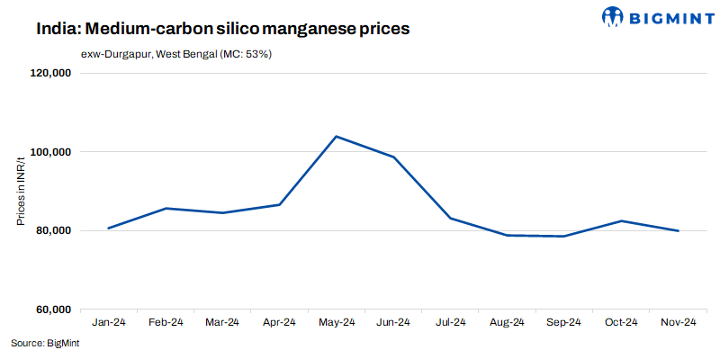India’s medium-carbon silico manganese (Mn: 53%, Si: 20%, C: 0.5% max) prices remained mostly stable, with a minor decrease of INR 200/t ($2/t) to INR 79,800/t ($944/t) on 27 Nov’24 from INR 80,000/t ($947/t) on 21 Nov’24. Offers were generally in the range of INR 78,500-81,000/t ($929-959/t), and minimal transactions took place at INR 80,000-81,000/t ($947-959/t). The total trade volume reached 400 t this week.