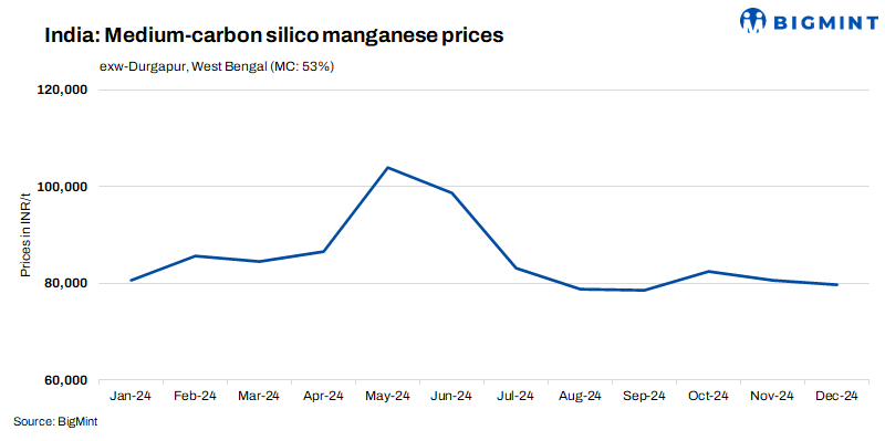 India’s medium-carbon silico manganese (Mn: 53%, Si: 20%, C: 0.5% max) prices soared by INR 1,100/t ($13/t) w-o-w to INR 80,900/t ($949/t) exw-Durgapur on 26 Dec’24. Indicative offers were at INR 81,000-81,500/t ($950-956/t), while trades of around 1,120 t took place at INR 80,000-81,000/t ($938-950/t). The rise in prices can be attributed to a lift in domestic demand. Meanwhile, export demand remained dull amid cautious market sentiments.