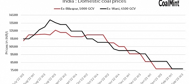 Prices of 4,500 GCV coal in Wani stood at INR 7,700/t on 20 February, while 5,000 GCV coal was assessed at INR 7,700/t in Chhattisgarh’s Bilaspur. Both prices remained unchanged w-o-w.