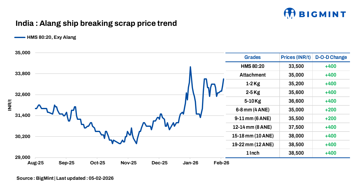 In Gujarat’s Alang market, ship-breaking melting scrap prices climbed up by INR 400/t d-o-d to INR 33,500/t ($371/t) ex-yard, according to BigMint’s assessment. Supported by an INR 200-500/t rise in semi-finished and finished steel prices during yesterday’s trading session, the regional market saw increased inquiries for scrap, prompting local suppliers to lift their offers today.
