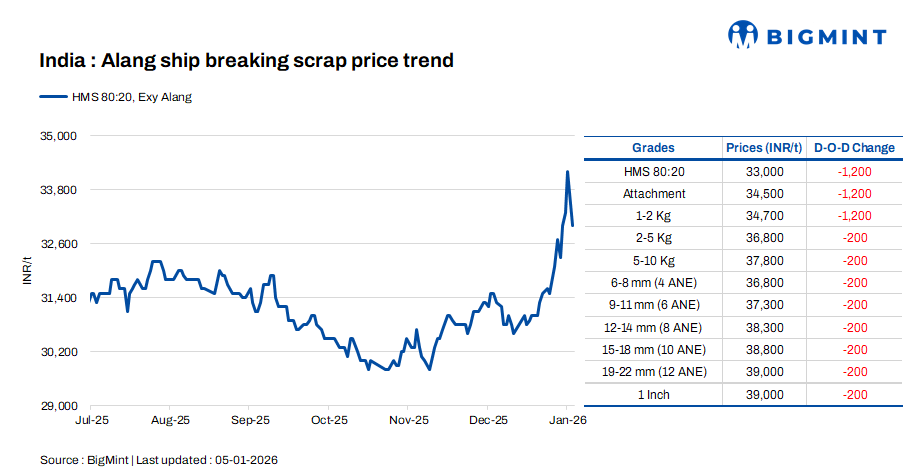 Ship-breaking melting scrap prices in Gujarat’s Alang market decreased by INR 1,200/t d-o-d on 5 Jan’25, according to BigMint’s assessment. HMS (80:20) prices stood at INR 33,000/t ($366/t) exy. Trading activity in the semis and finished steel segments slowed during the previous trading session. This, coupled with limited buying enquiries for scrap at higher price levels, prompted suppliers to reduce their offers.