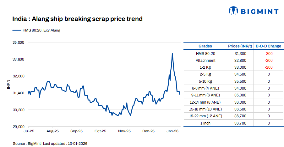 Ship-breaking melting scrap prices in Gujarat’s Alang market decreased by INR 200/t d-o-d on 13 Jan’26. According to BigMint’s assessment, HMS (80:20) prices stand at INR 31,300/t ($347/t) ex-yard. The regional steel market witnessed subdued trade activity due to the upcoming Uttrayan (Makar Sankranti) festival. Meanwhile weak scrap buying interest from local consumers prompted suppliers to lower their offers.