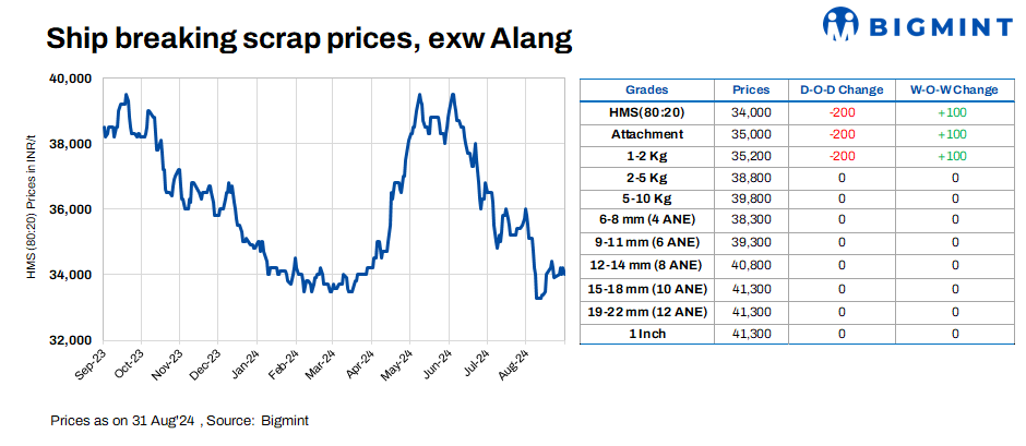 Ship-breaking melting scrap prices in Gujarat’s Alang market declined by INR 200/t d-o-d on 31 Aug’24. According to BigMint’s assessment, HMS (80:20) prices stood at INR 34,000/t ($405/t) ex-yard. Limited trade activity was observed for semi-finished and finished steel during yesterday’s trading session. Additionally, average trade activity in scrap prompted suppliers to reduce their offers today.