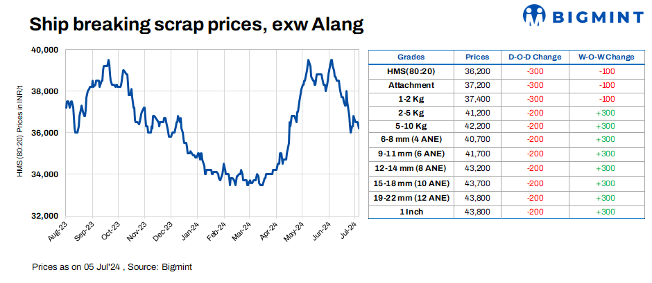 Ship-breaking melting scrap prices in Gujarat’s Alang market fell by INR 300/t ($3.6/t) d-o-d on 5 Jul’24. HMS (80:20) prices were assessed at INR 36,200/t ($434/t) exy. Semi-finished and finished steel prices fell by around INR 200-300/t in the region during yesterday’s trading session due to limited demand. Additionally, moderate trade activities in scrap prompted suppliers to reduce their offers today.
