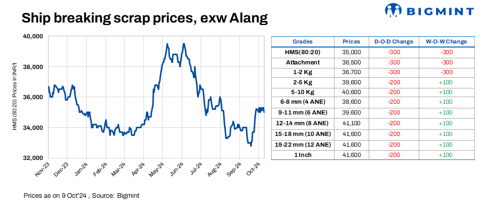 Ship-breaking melting scrap prices in Gujarat’s Alang market decreased by INR 300/t d-o-d on 9 Oct’24. According to BigMint’s assessment, HMS (80:20) prices stood at INR 35,000/t ($417/t) ex-yard. Need-based trade activity was observed in semi-finished and finished steel in the region during yesterday’s trading session. Additionally, moderate trade activity in scrap prompted suppliers to reduce their offers today.