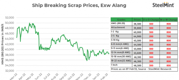 Ship-breaking melting scrap prices in Gujarat’s Alang market decreased by INR 300/t d-o-d on 7 Feb’23. As per SteelMint’s assessment, HMS (80:20) prices stand at INR 38,300/t exy. Limited purchase enquiries for scrap at higher prices along with moderate trade in semis and finished steel segments prompted scrap suppliers to reduce their offers.