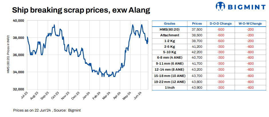 Ship-breaking melting scrap prices in Gujarat’s Alang market fell by INR 500/t ($6/t) d-o-d on 22 Jun’24, according to BigMint’s assessment, HMS (80:20) prices were assessed at INR 37,500/t ($449/t) exy. Limited demand for semi-finished and finished steel were observed in the region during yesterday’s trading session. Additionally, restricted trade activity in scrap prompted suppliers to reduce their offers today.