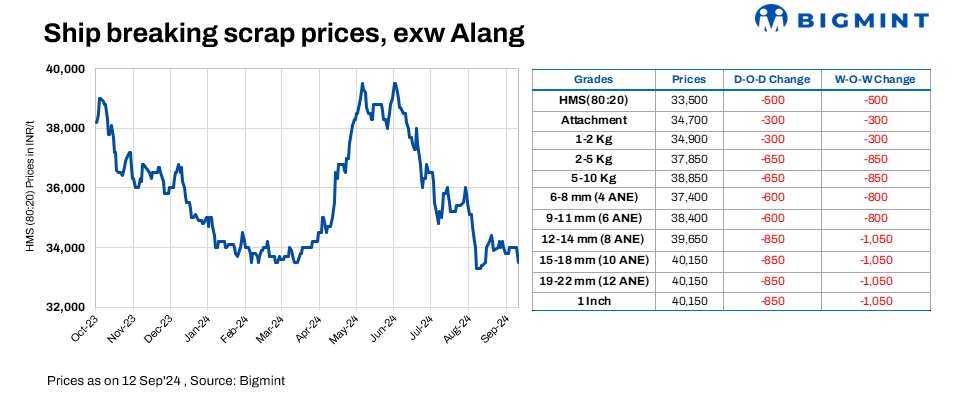 Ship-breaking melting scrap prices in Gujarat’s Alang market fell by INR 500/t d-o-d on 12 Sep’24, according to BigMint’s assessment. HMS (80:20) prices stood at INR 33,500/t ($399/t) exy. Dull demand for semi-finished and finished steel, along with limited scrap trade, led suppliers to lower offers today. Additionally, significant bid-offer price disparities were observed in major markets.