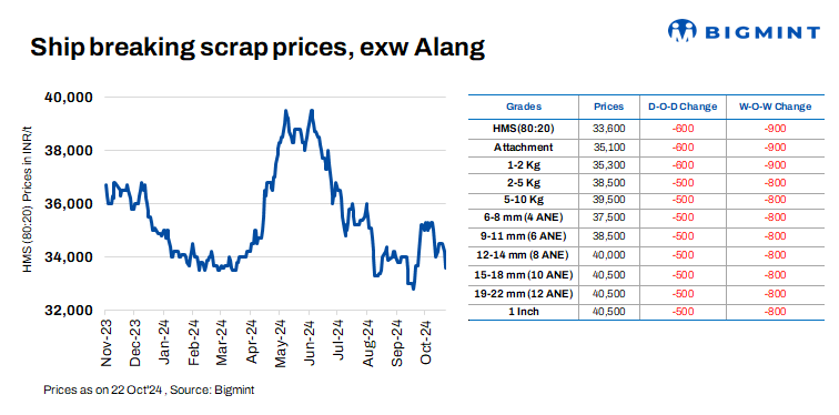 Ship-breaking melting scrap prices in Gujarat’s Alang market fell by INR 600/t d-o-d on 22 Oct’24, according to BigMint’s assessment, with HMS (80:20) at INR 33,600/t ($400/t) exy. Due to limited demand, semi-finished steel prices fell by around INR 700/t in the region during yesterday’s trading session. Additionally, average trade activities in scrap prompted suppliers to reduce their offers today.