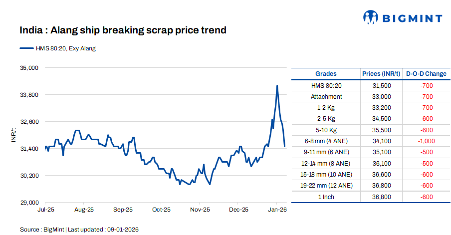 Ship-breaking melting scrap prices in Gujarat’s Alang market fell by INR 700/t d-o-d on 9 Jan’26. HMS (80:20) prices stood at INR 31,500/t ($350/t) exy. Trade activity in both semi-finished and finished steel remained sluggish during the previous trading session, with prices falling by INR 500-600/t. Additionally, weak scrap buying interest from local consumers prompted suppliers to lower their offers today.