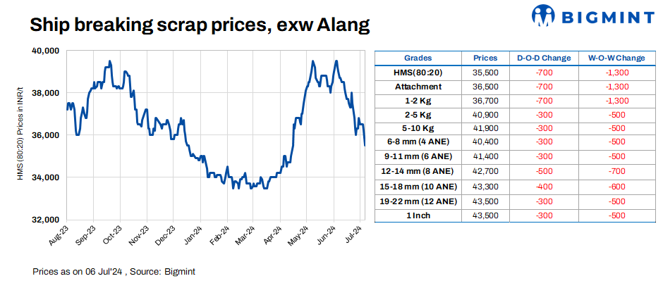 Ship-breaking melting scrap prices in Gujarat’s Alang market fell by INR 700/t ($8.4/t) d-o-d on 6 Jul’24. HMS (80:20) prices were assessed at INR 35,500/t ($425/t) exy. Semi-finished steel prices decreased by INR 500-600/t in the region during yesterday’s trading session, driven by limited demand. The decline was further influenced by liquidity issues and the arrival of domestic scrap at lower prices, prompting scrap suppliers to decrease their offers today.