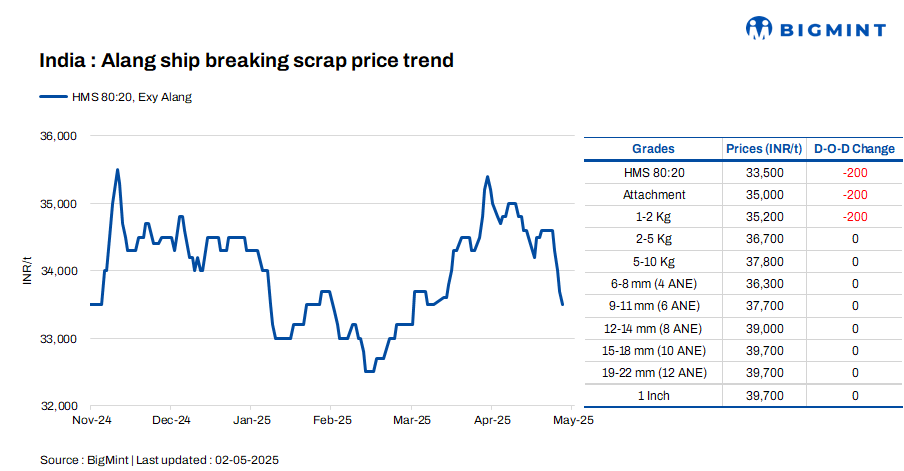 Ship-breaking melting scrap prices in Gujarat’s Alang decreased for the third consecutive day, with prices falling by INR 200/t d-o-d on 2 May’25. HMS (80:20) stands at INR 33,500/t ($399/t) ex-yard. There was a noticeable decline in demand for semi-finished and finished steel products in the region yesterday, which further slowed scrap trades. This prompted suppliers to revise down their offers today.