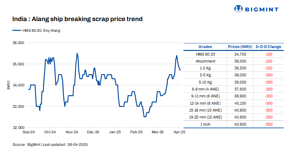 Ship-breaking melting scrap prices in Gujarat’s Alang decreased for the third consecutive day, with prices falling by INR 100/t d-o-d on 8 Apr’25. HMS (80:20) stands at INR 34,700/t ($404/t) ex-yard. There was a noticeable decline in demand for semi-finished and finished steel products in the region yesterday, which further slowed scrap trades. This prompted suppliers to revise down their offers today.
