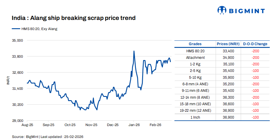 Ship-breaking melting scrap prices in Gujarat’s Alang market dropped by INR 200/t d-o-d on 25 Feb’26. According to BigMint’s assessment, HMS (80:20) stood at INR 33,400/t ($367/t) ex-yard. The correction was driven by (1) a decline of INR 200-300/t in semi-finished and finished steel prices due to weak trading activity and (2) average demand for scrap from IF mills.