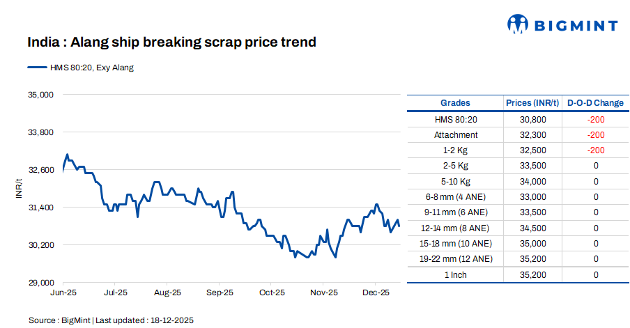 Ship-breaking melting scrap prices in Gujarat’s Alang market dropped by INR 200/t d-o-d on 18 Dec’25. According to BigMint’s assessment, HMS (80:20) prices are at INR 30,800/t ($341/t) ex-yard. Trade activity in semi-finished and finished steel slowed during the latter half of yesterday’s trading session, while only average buying interest from local consumers prompted suppliers to lower their offers today.