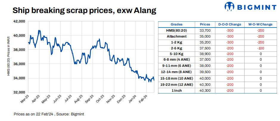 Ship-breaking melting scrap prices in Gujarat’s Alang market decreased by INR 300/t d-o-d on 22 Feb’24, as per BigMint’s assessment. HMS (80:20) prices were assessed at INR 33,700/t exy. Semi-finished steel prices fell by around INR 100-200/t in the region in yesterday’s trading session along with limited buying inquiries for scrap forced suppliers to reduce their offers today.