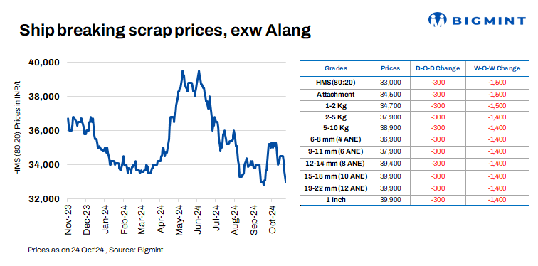 Ship-breaking melting scrap prices in Gujarat’s Alang market decreased by INR 300/t d-o-d on 24 Oct’24. According to BigMint’s assessment, HMS (80:20) prices stood at INR 33,000/t ($393/t) ex-yard. In yesterday’s trading session, limited transactions were observed amid muted demand for semi-finished and finished steel. This, combined with average scrap trade, led suppliers to adjust their offers downward.