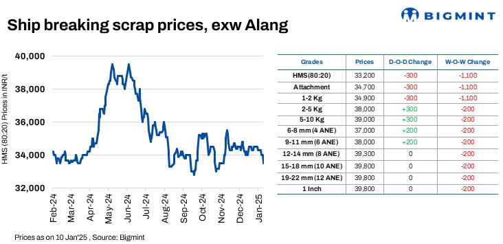 Ship-breaking melting scrap prices in Gujarat’s Alang market dropped by INR 300/t d-o-d on 10 Jan’25. According to BigMint’s assessment, HMS (80:20) stood at INR 33,200/t ($387/t) exy. During yesterday’s trading session, prices of semi-finished and finished steel dropped by approximately INR 200-600/t in the region, driven by weak demand. Subdued scrap trade levels led suppliers to reduce their offers today.