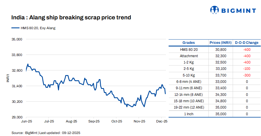 Ship-breaking melting scrap prices in Gujarat’s Alang market dropped by INR 400/t d-o-d on 9 Dec. According to BigMint’s assessment, HMS (80:20) prices stand at INR 30,800/t ($342/t) ex-yard. The decline was driven by INR 200-300/t corrections in semi-finished and finished steel prices due to weak trading activity. In addition, average demand for scrap from IF mills encouraged suppliers to lower their offers during today’s session.