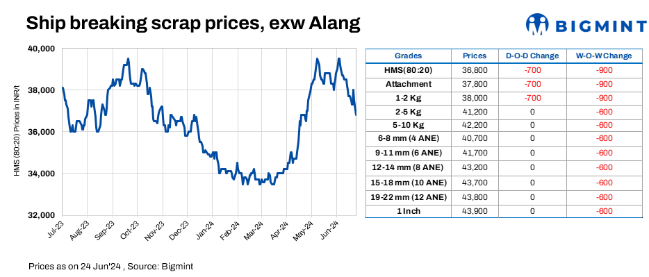 Ship-breaking melting scrap prices in Gujarat’s Alang market dropped by INR 700/t ($8.38/t) d-o-d on 24 Jun’24, according to BigMint’s assessment. HMS (80:20) prices were assessed at INR 36,800/t exy. Demand for semi-finished and finished steel remained low in the region during yesterday’s trading session. Additionally, restricted scrap trade activity prompted suppliers to adjust their offers downward today.