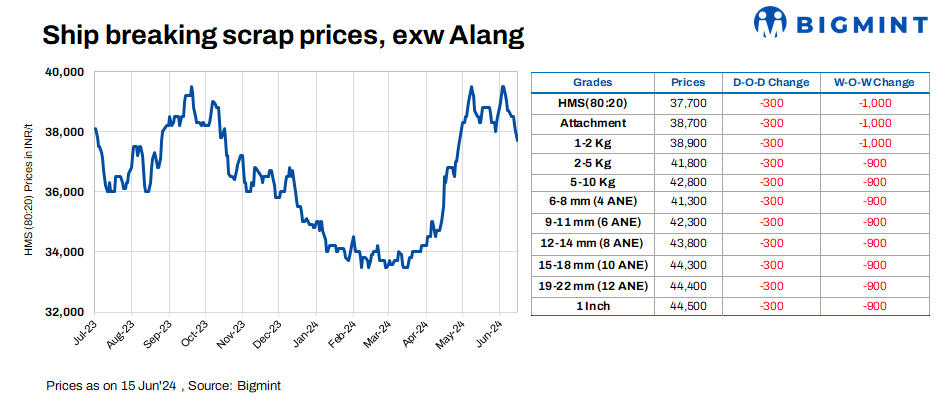 Ship-breaking melting scrap prices in Gujarat’s Alang market fell by INR 300/t ($3.6/t) d-o-d on 15 Jun’24, according to BigMint’s assessment, HMS (80:20) prices were assessed at INR 37,700/t ($451/t) exy. Semi-finished and finished steel prices fell by around INR 300/t in the region in yesterday’s trading session. This, coupled with average trading activities, prompted scrap suppliers to reduce their offers today.
