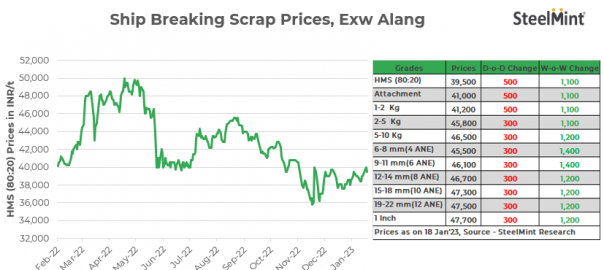 Ship-breaking melting scrap prices fell by INR 500/t d-o-d in Gujarat’s Alang market on 18 Jan’23. As per SteelMint’s assessment, HMS (80:20) prices stand at INR 39,500/t ex-yard. A drop in semi-finished steel prices in yesterday’s session and moderate buying inquires for scrap owing to weak sentiments in the spot market forced suppliers to reduce their offers.