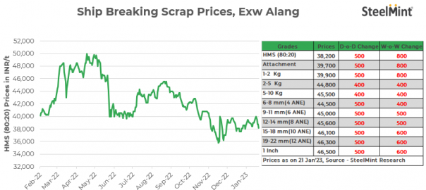 Ship-breaking melting scrap prices fell by INR 500/t d-o-d in Gujarat’s Alang market on 21 Jan’23, SteelMint’s assessment shows. HMS (80:20) prices opened at INR 38,200/t exy. The market saw volatile price movements in semi-finished steel in yesterday’s session. This along with limited trade for scrap prompted suppliers to reduce their offers today.