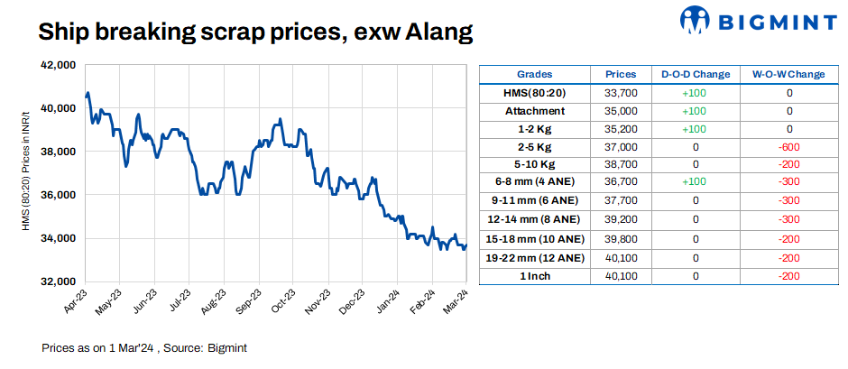 Ship-breaking melting scrap prices in Gujarat’s Alang market inched up by INR 100/t d-o-d on 1 Mar’24, as per BigMint’s assessment. HMS (80:20) prices were assessed at INR 33,700/t exy. Semi-finished steel prices improved by INR 100/t in the region in yesterday’s trading session and moderate buying interest for scrap prompted suppliers to hike offers today.