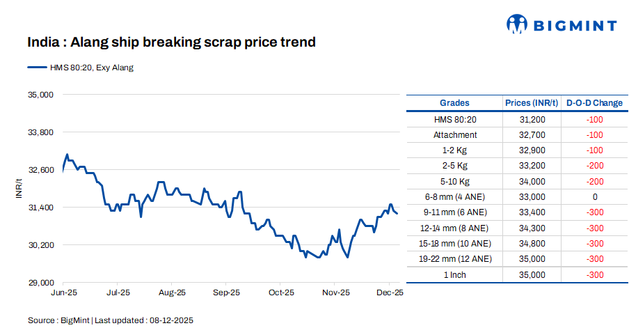 Ship-breaking melting scrap prices in Gujarat’s Alang decreased by INR 100/t d-o-d on 8 Dec’25. According to BigMint’s assessment, HMS (80:20) prices are at INR 31,200/t ($346/t) ex-yard. Trade activities for semi-finished and finished steel products have slowed down in the region, as seen in the previous trading session. Average demand from the Bhavnagar-based IF mills prompted a reduction in offers today.