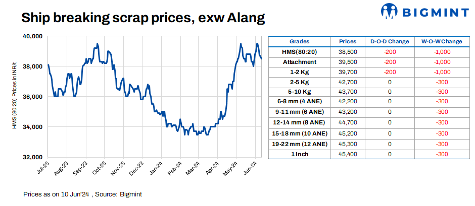Ship-breaking melting scrap prices in Gujarat’s Alang market decreased by INR 200/t d-o-d on 10 Jun’24. According to BigMint’s assessment, HMS (80:20) prices stand at INR 38,500/t ($461/t) ex-yard. Need-based trade activity was observed in semi-finished and finished steel in the region during last trading session. Additionally, moderate trade activity in scrap prompted suppliers to reduce their offers today.