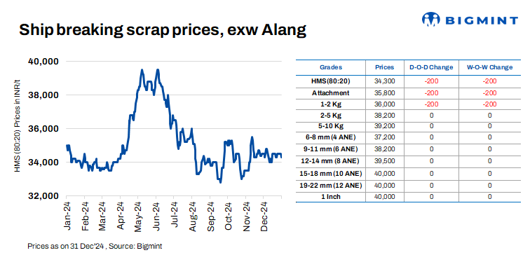 India’s ship-breaking melting scrap prices in Gujarat’s Alang market decreased by INR 200/t d-o-d on 31 Dec’24. According to BigMint’s assessment, HMS (80:20) prices stood at INR 34,300/t ($401/t) ex-yard. Yesterday’s session saw moderate trade activity in semi-finished and finished steel, while Bhavnagar-based mills’ scrap demand remained at an average level. As a result, scrap suppliers reduced their offers today.