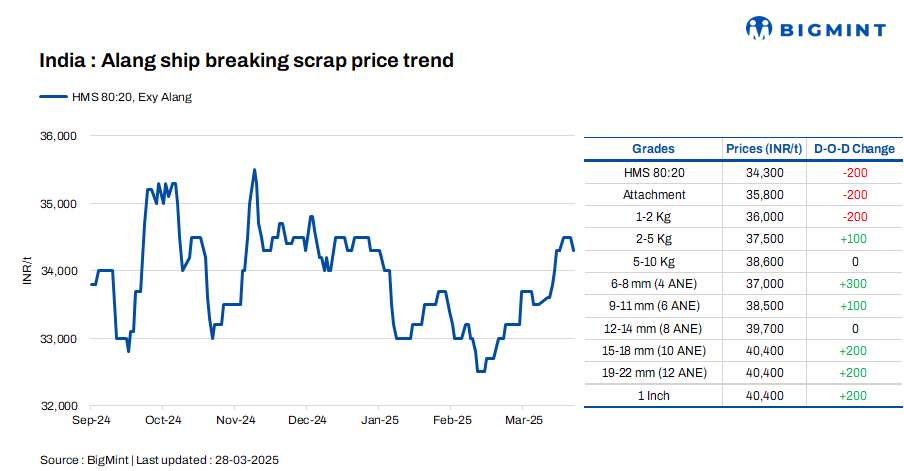 Ship-breaking melting scrap prices in Gujarat’s Alang market decreased by INR 200/t d-o-d on 28 Mar’25. According to BigMint’s assessment, HMS (80:20) prices stood at INR 34,300/t ($401/t) ex-yard. Demand for semi-finished and finished steel remained subdued during yesterday’s trading session, which, coupled with average scrap trade activity, led suppliers to adjust their offers downward today.